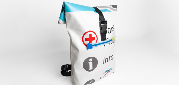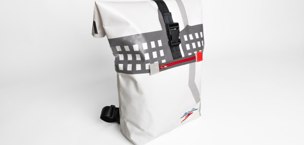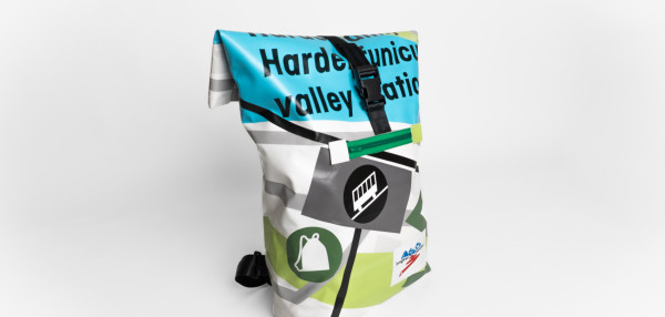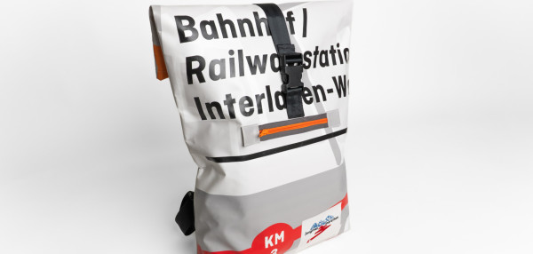 Each Jungfrau-Marathon backpack is unique. This backpack is handmade from used Jungfrau-Marathon frontlite-tarpaulins (510g/m2).