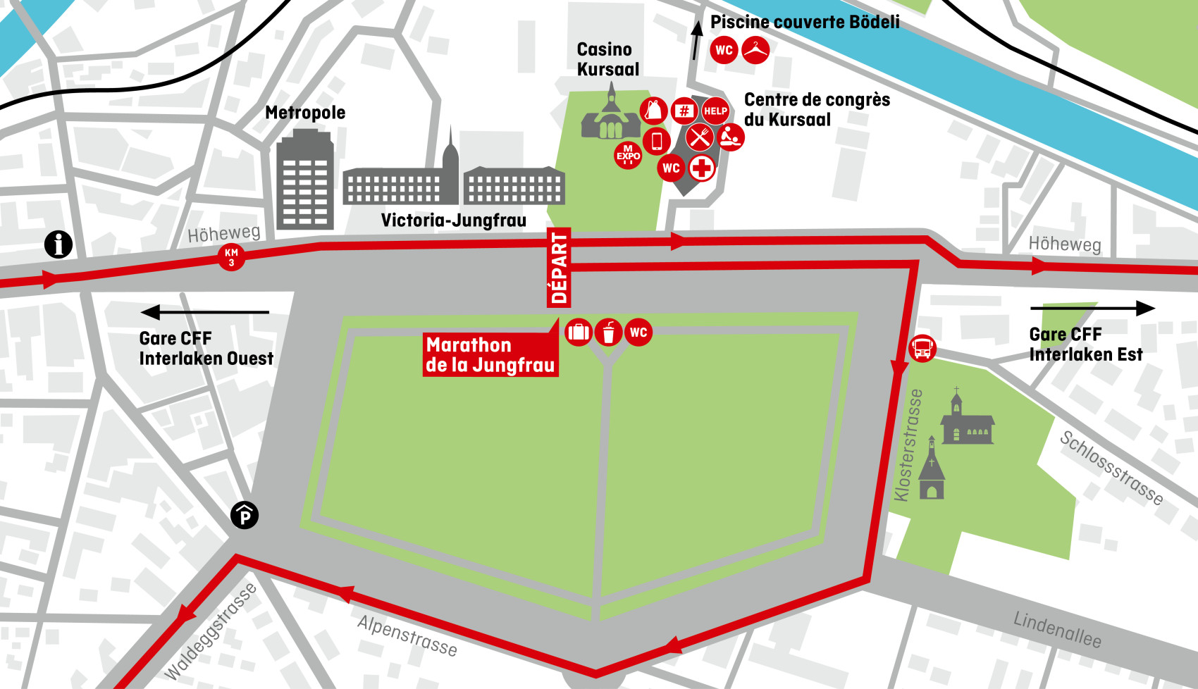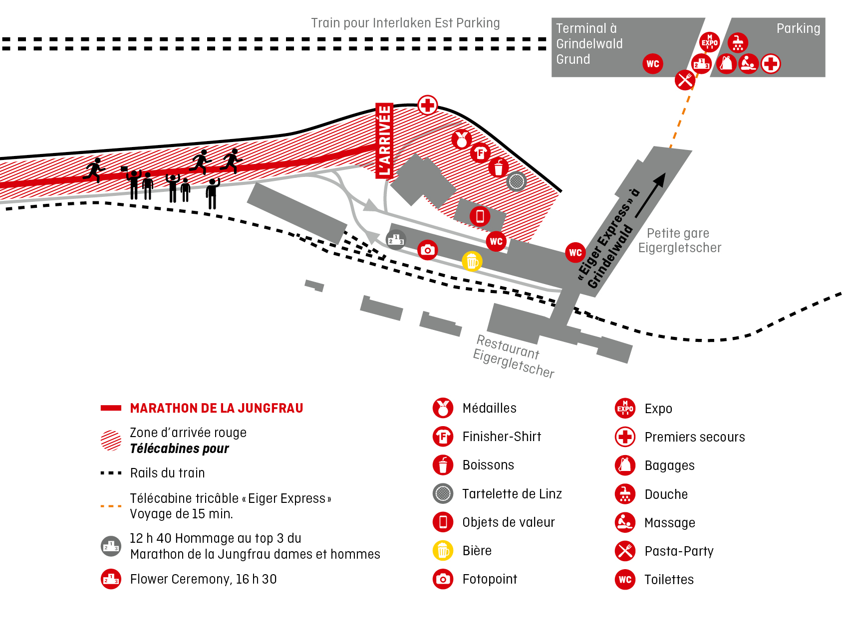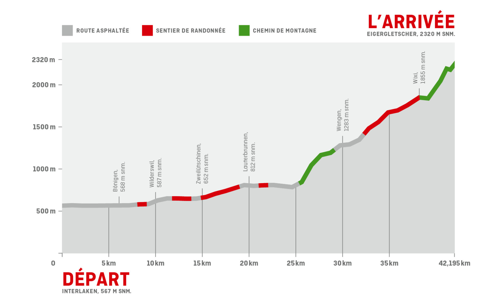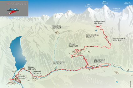 Au départ à Interlaken, les coureurs/-euses peuvent deviner vaguement l’arrivée en regardant en direction de la Jungfrau appartenant aux trois Majestueux l’Eiger, le Mönch et la Jungfrau. Le parcours mène les participant(e)s par des paysages changeants et variés: le long du Lac de Brienz, à travers des villages de montagne, devant un panorama alpestre fascinant. L’atmosphère bat son plein avec les lanceurs de drapeaux, les joueurs des cors des Alpes, les grosses cloches. C’est un tout enivrant. Les coureuses et les coureurs seront cordialement reçus à l’arrivée à Eigergletscher à 2’320 mètres d’altitude, au pied de la face nord de l’Eiger.